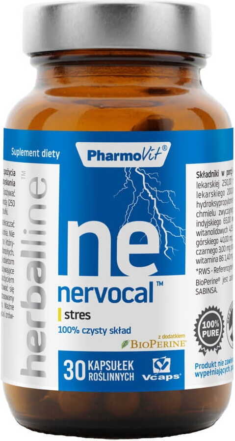 Nervocal ™ contains a blend of highly concentrated extracts and vitamins enclosed in a Vcaps® vegetable capsule. The composition was enriched with BioPerine® black pepper extract. Black pepper supports digestion and absorption of nutrients and increases the effectiveness of herbal ingredients. Valerian supports well-being and helps cope with stress associated with an intense lifestyle. Hops have a soothing effect on the nervous system. The mountain rosary helps the body adapt to emotional stress and physical exertion, and has a beneficial effect on tiredness and stress-induced headaches. The rosary helps to stimulate perception and improve the state of mind, and is also beneficial in difficulties falling asleep and loss of productivity at work. Lemon balm helps to relax and maintain a positive mood. Indian ginseng increases the body's resistance to stress and helps maintain physical and mental abilities in the event of weakness, fatigue and loss of concentration.