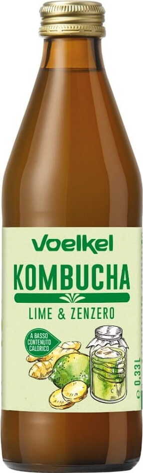 Biologische, gefermenteerde, koolzuurhoudende thee en kruidentheedrank met limoen- en gembersap.