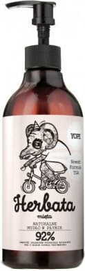 Natuurlijke dagelijkse handzeep van Yope. Het bevat 92% ingrediënten van natuurlijke oorsprong - verzorgt en beschermt de handen. Het wast de handen effectief en laat een aangename geur van thee met munt achter op de huid. Het product heeft een hygiënische pomp.