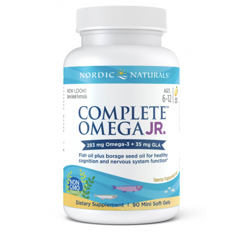 Complete Omega Junior łączy kwasy omega-3 EPA i DHA z oleju rybnego z GLA z oleju z nasion ogórecznika.