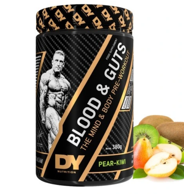 Suplement diety Dorian Yates Blood and Guts Pre-Workout to wysokiej jakości produkt, który przeznaczony jest do stosowania przed treningiem. Zawiera niezwykłą mieszaninę substancji aktywnych, takich jak aminokwasy - cytrulina, beta-alanina, arginina AKG, tyrozyna, witaminy – niacyna oraz ekstrakty roślinne z zielonej herbaty, pieprzu czarnego i guarany. Ma wygodną do stosowania postać proszku o pysznym smaku gruszki i kiwi.