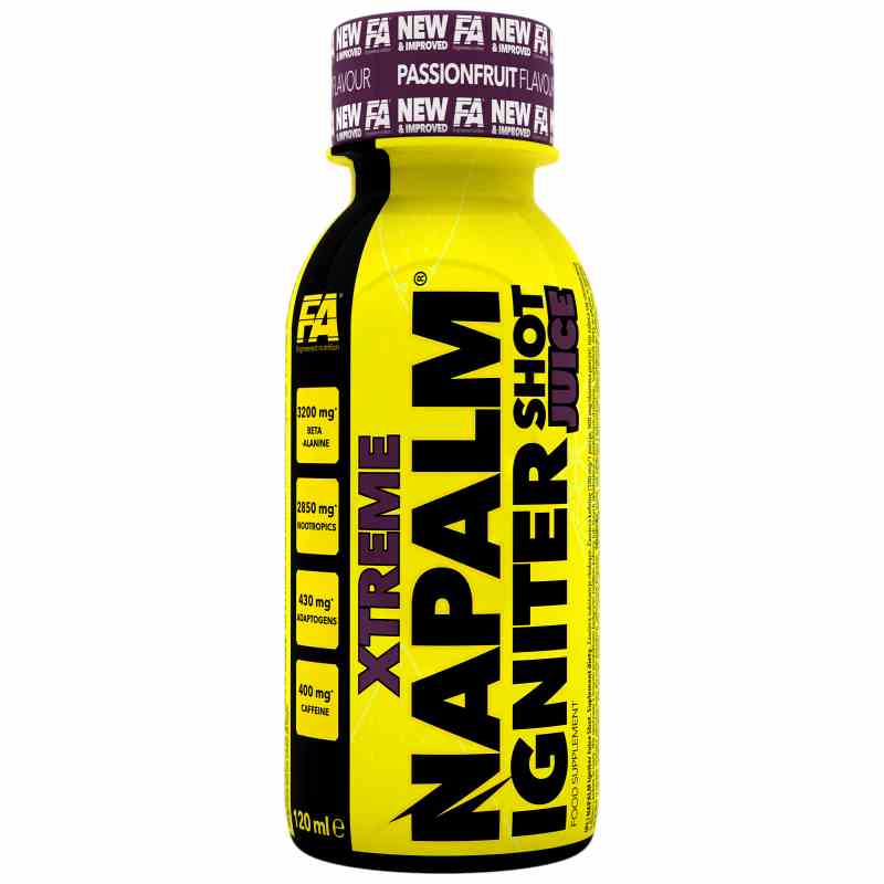 Suplement diety FA Napalm Igniter Juice Shot 120 ml to wysokiej jakości produkt, który zawiera mieszaninę wielu ważnych składników odżywczych i mineralnych. Dostarcza między innymi witamin, aminokwasów oraz wyciągów roślinnych. Przeznaczony jest głównie do stosowania przed treningiem.