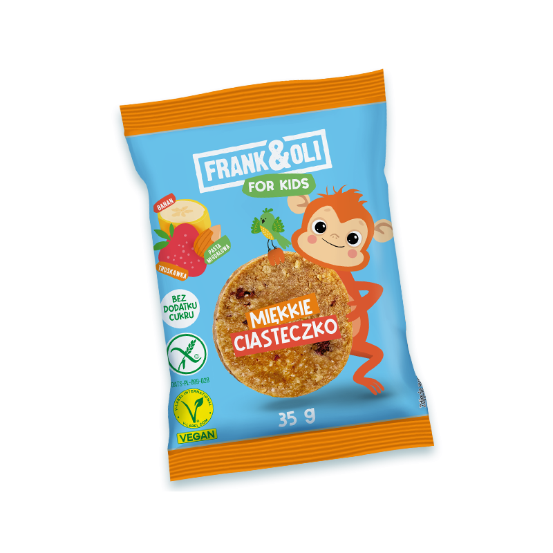 Frank & Oli For kids Miękkie ciasteczko Pasta migdałowa, banan, truskawka - najważniejsze Cechy: