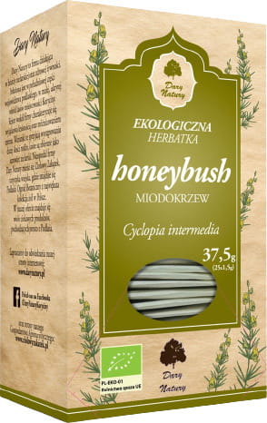Miodokrzew (Cyclopia intermedia lub Cyclopia subternata) to dziko rosnąca roślina występująca jedynie na terenach Południowej Afryki, spokrewniona z cenionym na całym świecie czerwonokrzewem, z którego przygotowuje się herbatę rooibos. Honeybush albo Heuningbos, czyli sporządzony z liści, łodyg oraz kwiatów miodokrzewu napój odznacza się subtelnym, słodkim z kwiatowo-owocową nutą, przypominającym rooibos, jednak delikatniejszym, smakiem i przyjemnym, miodowym aromatem. Herbata z miodokrzewu wykazuje właściwości relaksujące i uspokajające, ułatwia usypianie, działa antyoksydacyjnie, pomaga utrzymać właściwy poziom cukru we krwi, stosowana bywa także w czasie przeziębienia dla złagodzenia bólu gardła. Miodokrzew nie zawiera kofeiny, teiny oraz garbników, dzięki czemu idealnie nadaje się do spożycia dla dzieci, kobiet w ciąży, osób starszych oraz mam karmiących piersią. Wyśmienity zarówno w czasie mroźnych, zimowych wieczorów, jak i podany na zimno dla orzeźwienia latem.