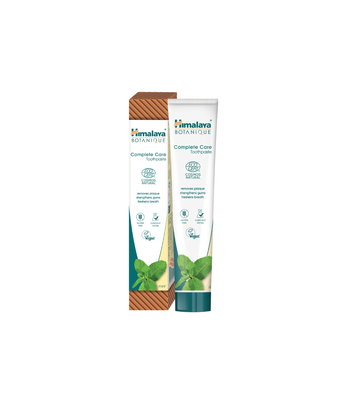 Pasta do zębów Himalaya Botanique Complete Care to ziołowa formuła zawierająca Neem, Owoc Granatu i Miętę, które skutecznie usuwają płytkę nazębną, wzmacniają dziąsła i odświeżają oddech. Produkt, bazujący na organicznych składnikach, nie zawiera fluoru, SLS, glutenu ani sztucznych barwników. Jest certyfikowany przez ECOCERT COSMOS NATURAL i w 100% wegański. Opakowanie jest przyjazne dla środowiska, z tubką i zakrętką nadającymi się do recyklingu, a papier wykonany został w pełni z recyklingu.