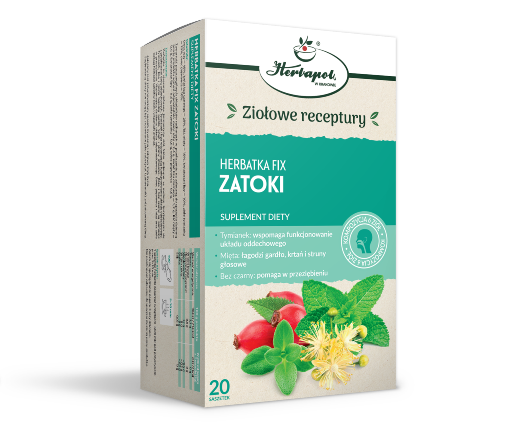 bzu czarnego – 1,2 g, liść mięty – 0,6 g, kwiatostan lipy – 0,6 g, ziele