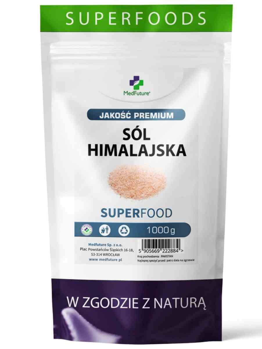 MedFuture Super Food Sól himalajska to duża ilość soli w praktycznym opakowaniu 1000g. Może być ona wykorzystywana w różnych potrawach jako zdrowsza alternatywa dla zwykłej soli kuchennej, nadając im unikalny smak i dostarczając cennych składników mineralnych.