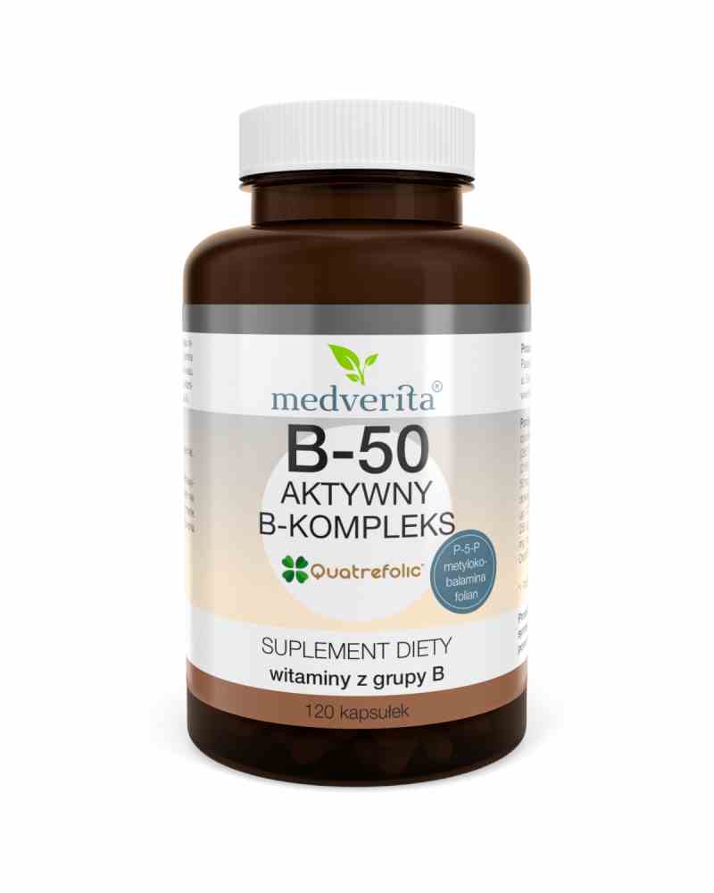 Podsumowując, suplement diety Medverita B-50 kompleks 120 kapsułek zawiera witaminy B1, B2, B3, B5, B6, B7, B9, B12 oraz inozytol, kwas p-aminobenzoesowy, cholinę i biotynę jednej kapsułce. Witaminy z grupy B są istotne dla metabolizmu makroskładników, takich jak węglowodany, tłuszcze i białka. Suplementacja tych witamin może być szczególnie ważna dla osób o zwiększonej aktywności fizycznej, osób poddawanych stresowi lub z intensywnym trybem życia.