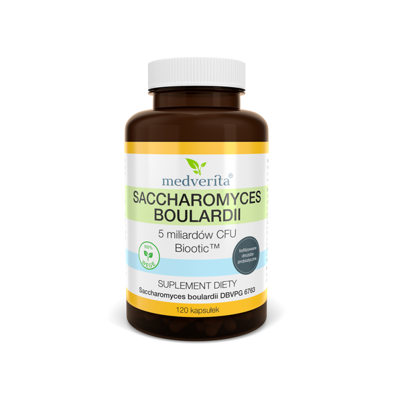 Suplement diety Medverita Saccharomyces Boulardii 120 kapsułek to produkt zawierający liofilizowane kultury drożdży Saccharomyces boulardii z dodatkiem naturalnego błonnika pokarmowego z drzew akacjowych w formie kapsułek.