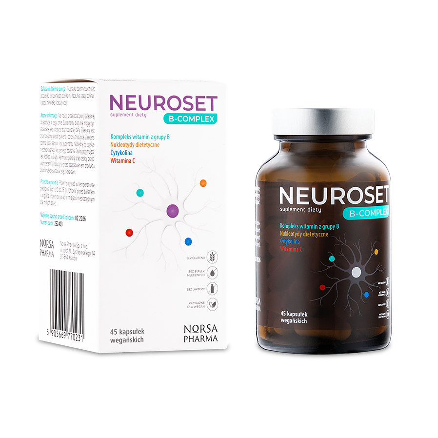 - Neuroset B-Complex to inteligentne i holistyczne rozwiązanie dla wsparcia funkcjonowania układu nerwowego, utrzymania prawidłowych funkcji psychologicznych i poznawczych oraz utrzymania odpowiedniego metabolizmu homocysteiny.