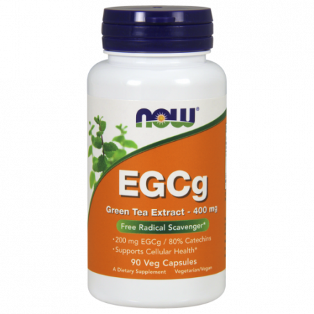 Suplement diety Now Foods Green Tea Extract EGCg zawiera 400 mg ekstraktu z liści zielonej herbaty standaryzowanego na zawartość 98% polifenoli, 80% katechin oraz 50% EGCg. Zawiera bardzo dużą ilość składników aktywnych, równających się ilości 4 filiżankom zielonej herbaty. Preparat jest wolny od jakichkolwiek sztucznych dodatków czy konserwantów. Nie zawiera GMO i jest odpowiedni dla wegan.