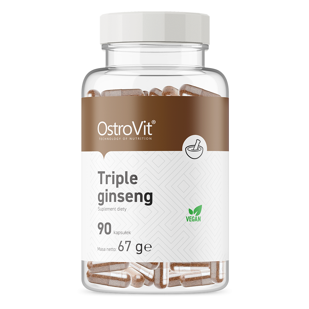 OstroVit Triple Ginseng VEGE to wegański suplement diety, który zawiera pięć różnych ekstraktów roślinnych - ekstrakt z korzenia żeń-szenia syberyjskiego oraz z korzenia żeń-szenia właściwego, a także ekstrakt z korzenia ashwagandhy, z nasion guarany i z owoców czarnego pieprzu