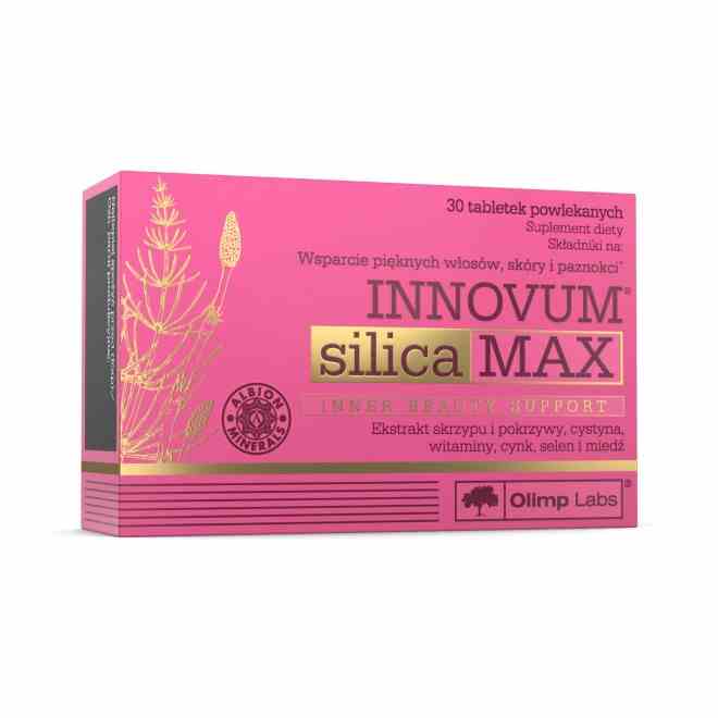 Suplement diety Olimp Innovum Silica MAX to wysokiej jakości produkt, który łączy w sobie cenne właściwości ekstraktów roślinnych ze skrzypu polnego i pokrzywy zwyczajnej z mnóstwem witamin i minerałów. Przeznaczony jest dla osób, które potrzebują wsparcia stanu włosów, skóry i paznokci. Ma wygodną do stosowania formę tabletek.