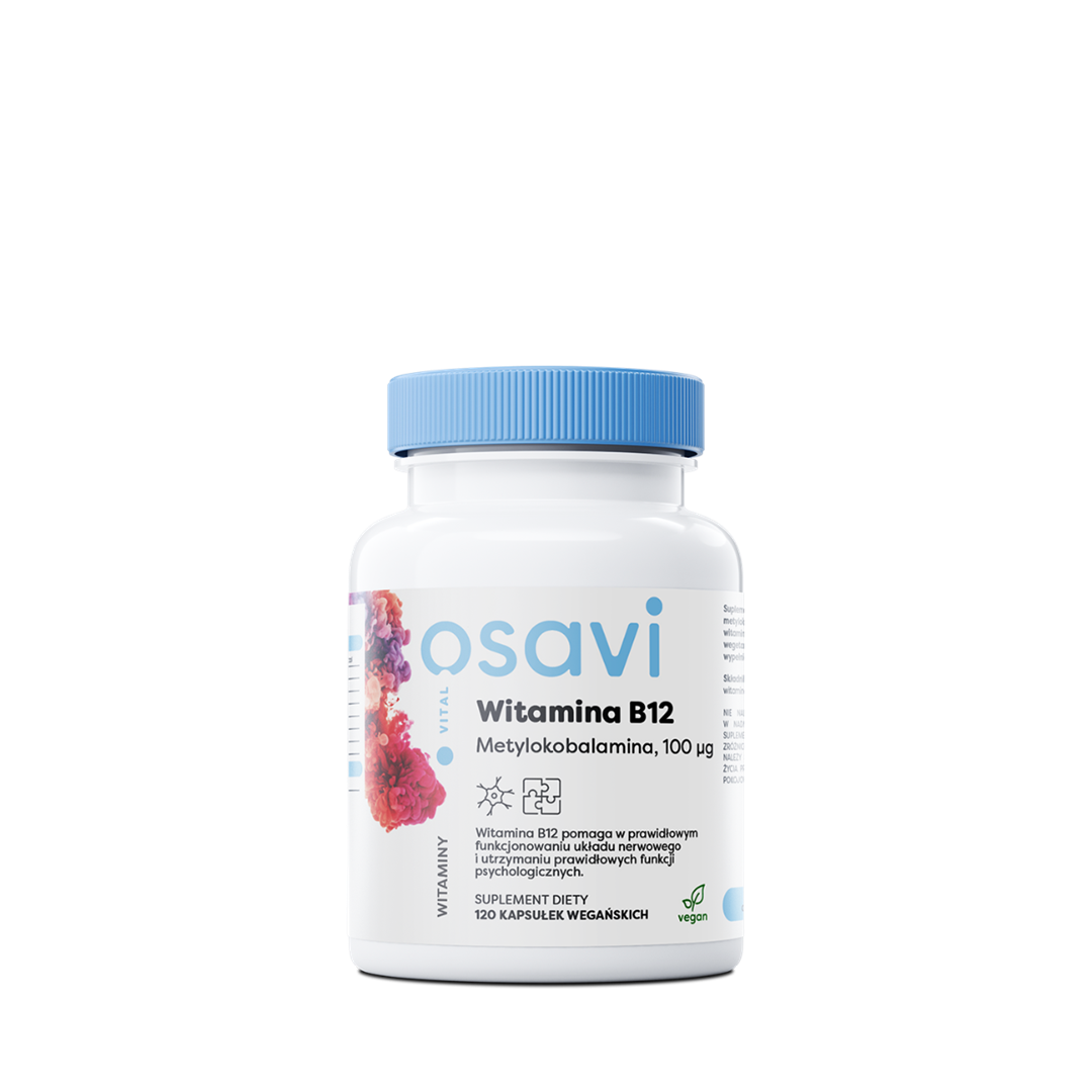 Suplement diety Osavi Witamina B12 (Metylokobalamina) 100μg to produkt zawierający witaminę B12 w formie kapsułki. Produkt nie zawiera substancji odzwierzęcych, może być zatem użytkowany przez wegan.