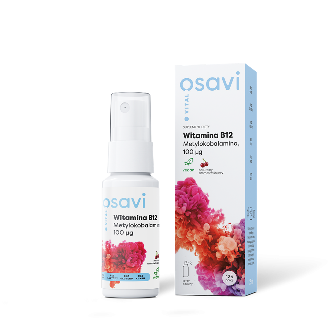 Suplement diety Osavi Witamina B12 (Metylokobalamina) 100μg Spray to produkt zawierający witaminę B12 w formie wygodnego doustnego sprayu o naturalnym wiśniowym aromacie. Produkt nie zawiera substancji odzwierzęcych, może być zatem użytkowany przez wegan.