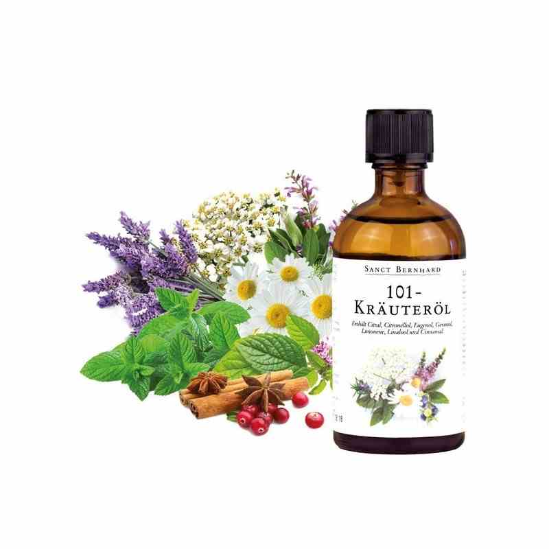 Sanct Bernhard Olejek 101 ziół 100 ml to wyjątkowy produkt, wzbogacony bogatym zestawem naturalnych składników roślinnych. Ten olejek to harmonijne połączenie 101 ziół, znanych ze swoich korzystnych właściwości, które od wieków są cenione ze względu na swoje wszechstronne działanie.