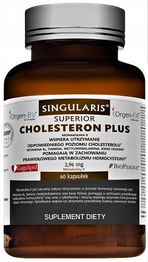 Suplement diety Singularis Superior CHOLESTERON Plus to wysokiej jakości produkt, który zawiera mieszankę cennych dla zdrowia człowieka substancji: ekstrakt z czerwonych drożdży z ryżu, który odznacza się zawartością 4% monakoliny K, witaminy z grupy B: tiamina, pirydoksyna, kobalamina i kwas foliowy. Preparat ten ma możliwie jak najkrótszy skład, sprawdzony pod kątem bezpieczeństwa.