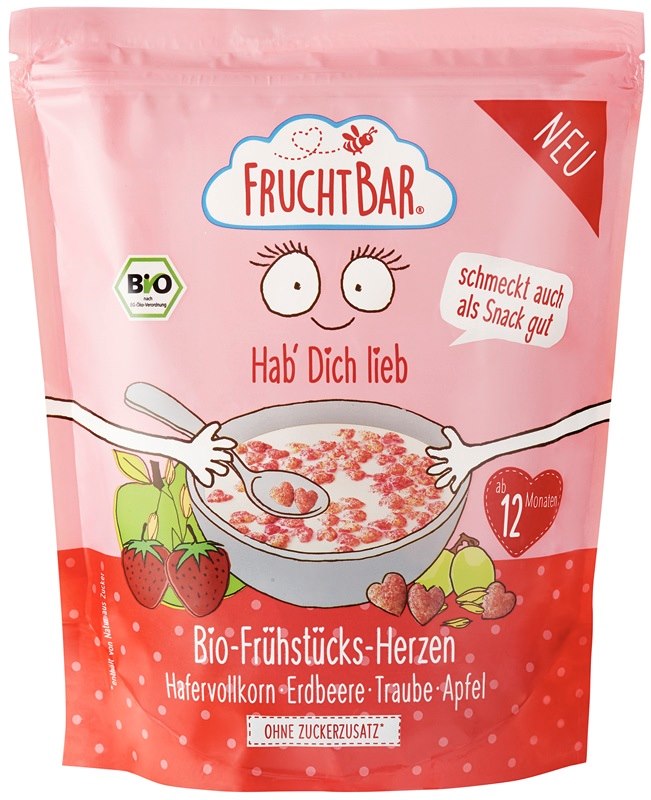 Śniadaniowe chrupki owsiane pełnoziarniste z truskawkami, winogronami i jabłkiem powyżej po 12 miesiącu BIO 125 g FRUCHTBAR