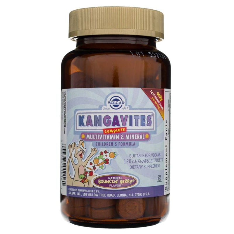Suplement diety Solgar Kangavites Bouncing Berry to mieszanka wapnia, cynku, magnezu, żelaza, choliny, chromu, jodu, selenu, manganu, miedzi, witaminy C i E, niacyny, kwasu pantotenowego, biotyny, witaminy B6, ryboflawiny, tiaminy, witamin A i D, kwasu foliowego, a ponadto zawiera ekstrakt z dzikiej róży, betakaroten, flawonoidy owocowe oraz sproszkowane warzywa i owoce : marchew, buraka, truskawki, brokuła, jabłko i morelę. Bogactwo tak wielu składników aktywnych sprawia, że produkt Kangavites ma szerokie spektrum działania na zdrowie i samopoczucie dzieci, wspiera ich prawidłowy rozwój a także zapewnia uzupełnienie diety w najważniejsze składniki mineralne.