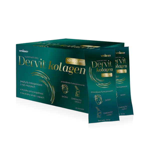 VITADIET Dervit kolagen 10000 mg 30 saszetek to suplement diety w wygodnej formie saszetek, stworzony z myślą o prostocie stosowania i wysokiej jakości składników. Produkt zawiera hydrolizowany kolagen, który został starannie dobrany, aby ułatwić jego rozpuszczanie i stosowanie. Saszetki są poręczne, co pozwala na łatwe przechowywanie i zabranie ich ze sobą w podróż, do pracy lub na siłownię.